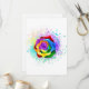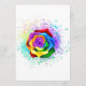 Rosa grande y floreciente con pétalos de arco iris sobre fondo blanco, pintado con salpicaduras de pintura colorida y brillante. 3.ª