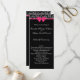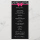 Este programa formal de bodas presenta un elegante patrón de rosa blanco y negro, un arco rosado caliente y texto blanco sobre un fondo negro.