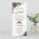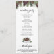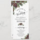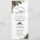 Este programa de bodas es sencillo, elegante, rústico y hermoso. Presenta un diseño acuático pintado a mano con estampados de ramas de pino y pinecones. La tipografía presenta caligrafía de escritura de encaje que ofrece un aire de elegancia y sofisticación mientras se sigue bajando a la tierra y el hogar. Tiene espacio para los detalles de la ceremonia, así como para la fiesta de la boda y un breve agradecimiento. Ideal para una boda al aire libre o de invierno.