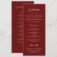 Este moderno programa de bodas minimalistas ofrece un diseño sencillo y limpio. El texto blanco y el fondo burdeos funcionan perfectamente para un boda de otoño. Este programa ofrece espacio para su pedido de ceremonia de boda, un breve agradecimiento personal y una lista de la fiesta de boda en el reverso.