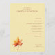 This wedding program features a minimalist and elegant design with a soft beige background, creating a serene and inviting atmosphere. The layout is clean and balanced, showcasing a list of ceremony events in a classic serif font that adds traditional charm. A single autumn leaf illustration in warm hues of red, orange, and yellow anchors the bottom left corner, adding an organic touch to the structured text. Perfect for formal weddings, this design combines simplicity with subtle sophistication, making it ideal for couples seeking a timeless aesthetic.
