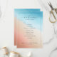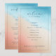 This wedding program features a serene and elegant design with a soft, blended watercolor background transitioning from light blue to peachy pink. The minimalist layout includes clean lines and a balanced composition, framed by a thin black border for structure. Elegant cursive and sans-serif typography highlights the ceremony details, creating an inviting atmosphere perfect for a sophisticated celebration. The gentle color palette and delicate brush strokes convey a joyful and intimate mood, making it ideal for capturing the essence of your special day.