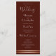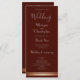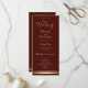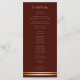 Un elegante y moderno programa de bodas burdeos con dos bandas de oro rosa en la parte inferior de la tarjeta. La ceremonia y el agradecimiento de los bodas se han incluido en la parte delantera del programa, mientras que toda la fiesta nupcial se ha incluido en la parte de atrás.