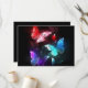 Tres mariposas luminosas, rojas, violetas, verdes, texturadas, nocturnas sobre fondo luminoso negro.