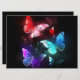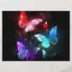 Tres mariposas luminosas, rojas, violetas, verdes, texturadas, nocturnas sobre fondo luminoso negro.