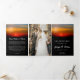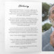 El programa funerario Birds and dawn se puede personalizar con dos fotos de su ser querido, una en negro y otra dentro del programa funerario. Añade obituario y orden de servicio junto con reconocimientos y un poema o salmo u otras palabras de cierre. La portada del programa del servicio conmemorativo incluye una foto de una bandada de pájaros cruzando el cielo al amanecer.