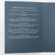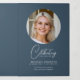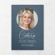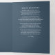 Moderna celebración triple de pizarra azul y blanco de la plantilla del programa de vida con un diseño elegante y minimalista diseñado para honrar a un ser querido con elegancia y claridad. La parte delantera incluye una foto redonda personalizado, con el nombre y las fechas de vida de su ser querido, presentados en una refinada mezcla de tipografía de sif y escritura. Los paneles interiores están bien estructurados para guiar a los huéspedes a través del orden de servicio, con secciones designadas para lecturas, tributos o elogios, y un área dedicada de reconocimiento para fieles, proveedores de servicios y expresiones de gratitud. Este diseño contemporáneo y digno es ideal para los servicios conmemorativos o la celebración de eventos vitales, ofreciendo un homenaje profesional y sincero.