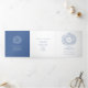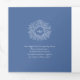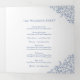 Programa de bodas cuadrado de arte botánico con forma de hoja azul con tu propia historia de amor y secciones de recuerdo. Personalice este programa de bodas triples con sus propios detalles de la ceremonia de boda, nombres de fiestas, historias de amor y dedicación. Diseño simple de hoja azul en torno a sus propias iniciales de monograma y en blanco y verde. Hay disponibles otros colores y elementos bodas coincidentes. © Dibujo y diseño original de la hoja de Sarah Trett para www.mylittleedenweddings.com en Zazzle.