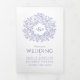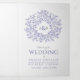 Programa de bodas de arte botánico con hojas de color azul morado, con tu propia historia de amor y secciones de recuerdo. Personalice este programa triple de bodas con sus propios detalles de la ceremonia de boda, nombres de fiestas, historias de amor y dedicación. Diseño simple de hojas en torno a sus propias iniciales de monograma en azul púrpura y gris sobre un material de tarjeta blanca. Hay disponibles otros colores y elementos bodas coincidentes. © Dibujo y diseño original de la hoja de Sarah Trett para www.mylittleedenweddings.com en Zazzle.