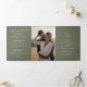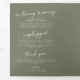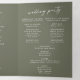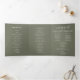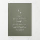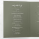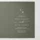 Este programa triple de boda de moda boho verde oliva es perfecto para un boda minimalista. El estilo bohemio moderno, en tonos tierra verde oscuro, presenta una caligrafía rústica sencilla con un estilo único y clásico. Personaliza tu programa de bodas con tus iniciales, nombres, fecha y ubicación del boda, tu cita o letra favorita, orden de servicio, fiesta de bodas, mensaje conmemorativo de la memoria, mensaje de ceremonia sin conexión, nota de agradecimiento y foto.