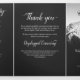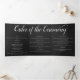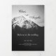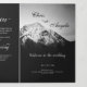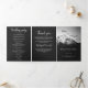 Programa plegable triple de boda en blanco y negro bajo las montañas. Fotografía de paisaje de una montaña cubierta de nieve con oscuridad abajo y cielo nublado blanco arriba. Los nombres de la pareja están en fuente negra sobre la montaña en el cielo y todos los detalles están en fuente blanca debajo de la montaña. Productos de boda completamente personalizables.