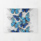Composición vertical de mariposas morfo realistas, azules y blancas sobre fondo texturado gris. Mariposa morfo azul.