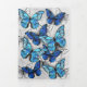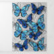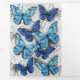 Composición vertical de mariposas morfo realistas, azules y blancas sobre fondo texturado gris. Mariposa morfo azul.