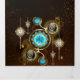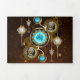 Lentes turquesa con un reloj de antigüedades con engranajes de latón y llaves doradas sobre un fondo oxidado y marrón. Estilo Steampunk.