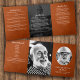 Esta elegante tarjeta conmemorativa de la celebración de la vida cuenta con un rico fondo de cuero marrón rojizo combinado con un elegante guión blanco y fuentes serif, lo que ofrece un tono cálido y sincero. El panel frontal incluye un marco de foto circular y un texto tributario bellamente escrito, que proporciona una introducción digna a la vida que se recuerda. El diseño interior está cuidadosamente organizado para guiar el orden del servicio, incluye reconocimientos y un mensaje o poema conmovedor, o cualquier otro texto de su elección, todo ello realzado por paneles fotográficos en blanco y negro. Esta plantilla ofrece un equilibrio de sofisticación y sentimiento, lo que lo hace ideal para servicios conmemorativos o celebración de eventos de la vida. La estética general evoca calidez, gratitud y recuerdo, ayudando a las familias a honrar a su ser querido con gracia y significado.