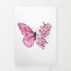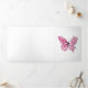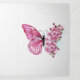 Arreglo floral de mariposa rosa con flores japonesas de cerezo rosadas sobre fondo blanco.