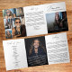 Sophisticated, modern trifold funeral program template with a striking black background and elegant white script typography, designed to create a timeless and dignified memorial keepsake. This layout includes space for an obituary, thank you message, order of service, memorial poem, and seven photo placements, allowing families to beautifully showcase cherished images alongside meaningful tributes. The high contrast black and white design conveys a sense of grace and reverence, making it a heartfelt choice for honoring a loved one’s memory and providing guests with a lasting remembrance of a life well lived.