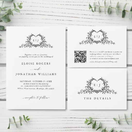 This elegant tri-fold wedding invitation features refined calligraphy and modern typography in a clean, minimalist layout. The delicate botanical crest monogram adds a timeless romantic touch while keeping the overall design chic and sophisticated. The tri-fold format provides generous space to include ceremony details, wedding timeline, venue information, icons, and a convenient QR code linking to your wedding website. A beautiful photo section on the back adds a personal touch, making this design perfect for modern, classic, or formal celebrations. Stylish, practical, and thoughtfully designed, this invitation allows couples to share all essential wedding information in one elegant piece of stationery.