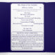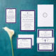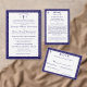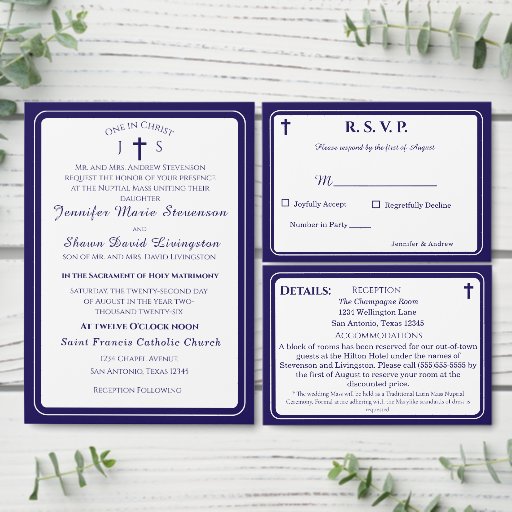 Interior is of a white background with navy-blue border. With explanations of the Mass displayed throughout, this elegant design also includes the name of the wedding officiant, names of altar servers, names of the parents of the bride and parents of the groom, wedding party names including the names for a maid-of-honor and best man, room for up to seven bridesmaids and groomsmen names, plus the names of the flower-girl and ring bearer. In addition, design of back cover features your text, a bible verse (or your message) and a prayer request for the happy couple against a navy background. All text is customizable. Designed to coordinate with the "Timeless Catholic Monogrammed Wedding Suite" collection.