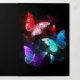 Tres mariposas luminosas, rojas, violetas, verdes, texturadas, nocturnas sobre fondo luminoso negro.