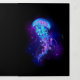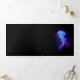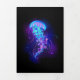 Gran medusa azul, de dibujo artístico, brillante y brillante, con largos tentáculos sobre fondo negro con bioluminiscencia violeta. Luminosas medusas.
