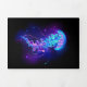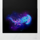 Gran medusa azul, de dibujo artístico, brillante y brillante, con largos tentáculos sobre fondo negro con bioluminiscencia violeta. Luminosas medusas.