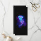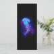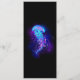 Gran medusa azul, de dibujo artístico, brillante y brillante, con largos tentáculos sobre fondo negro con bioluminiscencia violeta. Luminosas medusas.