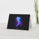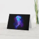 Gran medusa azul, de dibujo artístico, brillante y brillante, con largos tentáculos sobre fondo negro con bioluminiscencia violeta. Luminosas medusas.