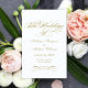 La caligrafía dorada antigua grande deletrea "La Boda De" en un elegante guion ornamentado a través de este elegante programa de ceremonia. Los florituras decorativas en dorado cálido enmarcan el diseño sobre un fondo blanco limpio para un aspecto formal y atemporal. Las páginas interiores son totalmente personalizables para tu corte nupcial, orden de ceremonia y un mensaje personal de agradecimiento en la cubierta trasera. Los programas se imprimen en papel de peso de texto y llegan planos, requiriendo un simple pliegue central.