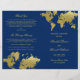 Un lujoso mapa mundial estilo hoja de oro brilla sobre un fondo azul marino intenso en este llamativo programa de ceremonia para parejas amantes de los viajes y bodas en destinos exóticos. "Ceremonia de Matrimonio Uniendo" presenta sus nombres en elegante letra cursiva debajo del mapa dorado, con acentos de salpicaduras de oro que añaden profundidad artística. Las páginas interiores son totalmente personalizables para su cortejo nupcial, orden de la ceremonia y un mensaje personal de agradecimiento en la cubierta trasera. Los programas se imprimen en papel de peso de texto y llegan planos, requiriendo un simple pliegue central.
