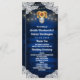 Programas de Boda en Tarro de Mason de Girasoles con Encaje de Madera - presentan un fondo de madera de granero azul recortado con encaje y decorado con luces centelleantes de cuerda de color cálido. El diseño también presenta un ramo de girasoles dentro de un tarro de mason donde puedes personalizar las iniciales a las de tu elección.