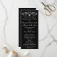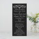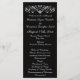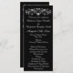 Elegante Programas Flourish de Bodas Verticales en Blanco y Negro con un florido desplazamiento con el corazón en la parte superior con elegantes letras de guiones blancos y modernos. Este es un programa de bodas vertical de 4" x 9". Simplemente utilice los campos de plantilla para agregar sus propios detalles de la ceremonia de boda o utilice el botón "Personalizar" para añadir o borrar líneas de texto o mover cosas. programas de bodas negras, programas de bodas en blanco y negro, programas de bodas simples, programas de bodas baratas, programas de bodas verticales, elegantes, florecientes, de corazón, programas de bodas a dos lados, programas de bodas regales, de cartón, programas de flor.