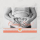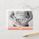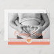 Su moderna tarjeta de invitación de fotos del embarazo con una foto creativa añadida y sus nombres y el mes de la llegada del bebé. Borde de melocotón con corazón pintado.