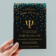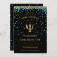 Invitación a graduación de la Escuela de Psicología con confetti purpurina azul y oro y un símbolo de psi de oro. Personaliza el texto para tu ceremonia de graduación! Nota: El purpurina de oro es un efecto impreso, no se usará ningún purpurina real para hacer estas invitaciones.