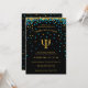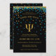 Invitación a graduación de la Escuela de Psicología con confetti purpurina azul y oro y un símbolo de psi de oro. Personaliza el texto para tu ceremonia de graduación! Nota: El purpurina de oro es un efecto impreso, no se usará ningún purpurina real para hacer estas invitaciones.