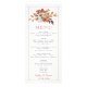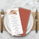La carta de la recepción de bodas presenta una impresionante combinación de flores y hojas de otoño en tonos terracota y beige que adornan la parte superior del frente, rodeadas por un borde blanco para un aspecto realmente clásico. En la parte trasera de la tarjeta, los clientes encontrarán otro bonito ramo de flores caídas, esta vez sobre un fondo de arcilla de terracota, enmarcado por un borde blanco para completar el cuadro. Esta tarjeta de menú añade un toque de elegancia y belleza a cualquier recepción de boda. La cobertura se ha diseñado utilizando algunos activos de Freepik.com