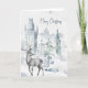 Una hermosa escena en acuarela de un pueblo antiguo nevado con torres y un ciervo macho en primer plano. El texto en la parte superior dice "Feliz Navidad" pero puedes escribir tu propio mensaje de vacaciones.