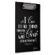Un portapapeles negro con un verso bíblico blanco "Puedo hacer todas las cosas a través de Cristo que me fortalece". Se trata de un portapapeles que se puede personalizar en el frente y en el reverso con un nombre u otras palabras > simplemente elimine esa opción si no la utiliza.