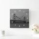 Reloj en la pared con una foto en blanco y negro al atardecer del puente Mackinac de la ciudad de Mackinaw, Michigan. El puente es un puente colgante que atraviesa los estrechos de Mackinac para conectar las penínsulas superior e inferior de la ciudad de Michigan. ¿Buscando más impresiones o productos? Siéntete libre de visitar mi tienda: http://www.zazzle.com/timelessmomentsphtgy Esta foto fue tomada por Jennifer White con Timeless Moments Photography. Todas las imágenes tienen derechos de autor © Timeless Moments Photography.