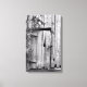 La impresión de tela de 'Puerta de granero con árbol' es una imagen rústica de la madera gastada de una puerta de granero con un árbol que crece contra la pared exterior de las tablas. Imagen en blanco y negro.