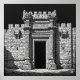 Un gráfico de alta calidad de una imagen artística de un graffito de una intrincada puerta de la ciudad, creada por líneas finas rayadas a través de una capa oscura para revelar una capa más clara debajo. Las intrincadas líneas grabadas detallan la textura de la piedra y los adornos tallados, lo que le da un aire clásico y atemporal.