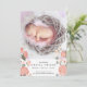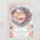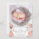 Anuncie la llegada de su bebé con nuestro dulce anuncio de nacimiento floral con la foto de su pequeña, adornada con flores rosas, brotes y vegetación. Personalice el nombre del bebé, las estadísticas de nacimiento y sus nombres.