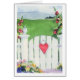 Tarjeta de nota en blanco con corazón en la puerta del jardín.