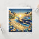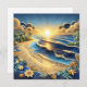 Representación en Ai de una puesta de sol en el océano con olas azules bonitas, una playa de arena, palmeras y flores realizadas en un efecto 3D de quilling en papel.