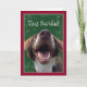 La tarjeta de Navidad chistosa ofrece la foto de un perro feliz con una sonrisa gigante en un fondo del navidad rojo y verdes con efecto del bokeh. Juego de palabra divertido en el saludo de Feliz Navidad.