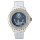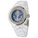 Mirador diamante de imitación personalizado con ancla de plata. Agregue su nombre a este reloj náutico o deje el campo de nombre en blanco si sólo necesita el diseño. Femenino y elegante reloj diamante de imitación con correa blanca y rostro de ancla náutica.