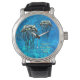Calamar de colores brillantes flotando hacia arriba desde lo profundo de las aguas azules verdes del océano con sus tentáculos largos y oscuros colgando. La luz se filtra a través del agua hasta el paisaje de fondo de hierbas, rocas y arena. Hay mucho espacio abierto en este reloj de pulsera de vida marina para el personalizar - agrega tu mensaje personal. Envíame un correo electrónico si necesitas ayuda con este o cualquiera de mis productos.