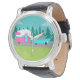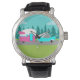 Este Camper Retro / Trailer and Car Watch cuenta con un moderno y minimalista dibujo personalizado de mediados de siglo que le dejará listo para tomar la carretera. Un homenaje a los años 50, este diseño presenta un auto turquesa vintage con la parte blanca, tirando de un remolque de viaje kitschy a su destino final. El RV retro, perfectamente restaurado, tiene una mitad inferior rosa caliente, la mitad superior blanca y un rayo turquesa que separa los dos. La puerta del lado del camper también es de color turquesa. El acento final es el ala rosa caliente que sobresale desde la parte trasera de esta casa sobre ruedas. Los alegres campistas están conduciendo por un camino gris. La carretera está rodeada de exuberante hierba verde. Como telón de fondo, podemos ver las siluetas verde azuladas de un verdadero bosque de cedros, frente a un cielo acuático con nubes esponjosas y azul claro. Este diseño es perfecto para todos los que vienen de hippies retirados, hipsters recién llegados o cualquiera que quiera revivir algunos recuerdos de la infancia grandiosos. La mejor parte es que nadie pregunta: "¿Estamos ahí todavía?"