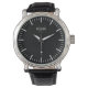 Cuero negro vintage elegante reloj de personalizado masculino. Crea tu propio reloj de ropa de lujo con nombre personalizado. Diseño elegante de dial de reloj intemporal con índices finos que incluyen minutos y horas pero sin números. Añade tu propio monograma de personalizado, nombre personalizado, nombre de diseñador, iniciales, año de nacimiento, logotipo, icono, imagen fotográfica, etc. Presencia sofisticada de estilo minimalista moderno con elegante plantilla de tipografía de escritura. Lujoso reloj para él. Hacerlo un nuevo regalo genial para un novio, novio, padre, padre, esposo, hermano, hijo, novio, abuelo, abuelo, abuelo, padrastro, tío, compañero de trabajo, empleado, jefe de la empresa, compañero de negocios, colega, mejor amigo, profesor, entrenador o jubilado. Ideas monogramadas únicas de regalo para el cumpleaños de los hombres, graduación, aniversario, jubilación, Navidades, vacaciones, fiesta nupcial, apreciación, empleo, trabajo, trabajo, etc. Diámetro grande de unos 44 mm. Estilo clásico vintage con correa de muñeca de cuero negro de moda de 22 mm. Todo color de fondo negro o personalizado. Perfecto para las celebraciones del año 20, 30, 40, 50, 60, 70, 80, de los años 90. Relojes de cuarzo asequibles por menos de $100. Ideal para uso diario informal y ocasiones especiales con traje. También disponible para otros modelos con cuero marrón o pulsera de acero.