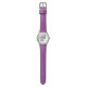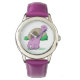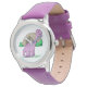 Dino the Dinosaur Cute Kid's Watch presenta un Dino el dinosaurio púrpura parado en su cueva con brillantes solares. Un regalo perfecto para el amante de los dinosaurios en su vida. ¡Elige el estilo y el color de tu reloj!